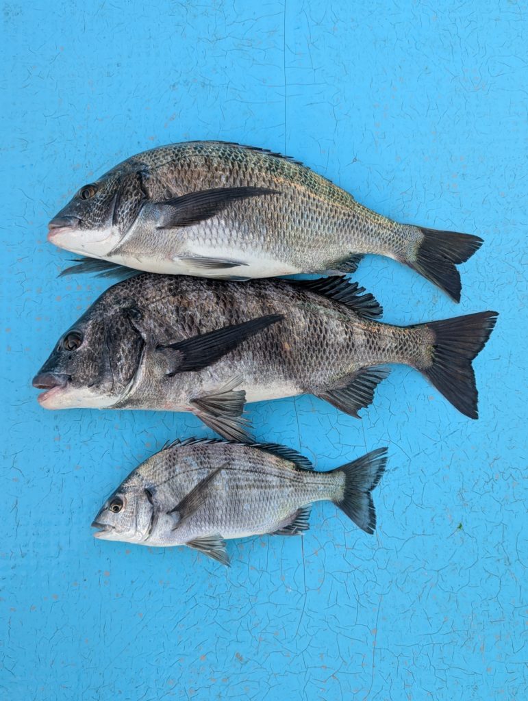 名古屋市の石神さんが鳥の鼻筏 チヌ31〜48cm 3匹 仕掛/サオ5.3 ハリス1.5 チヌ... -